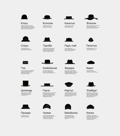 В качестве дополнительной графики отрисованы все виды и типы шляп.