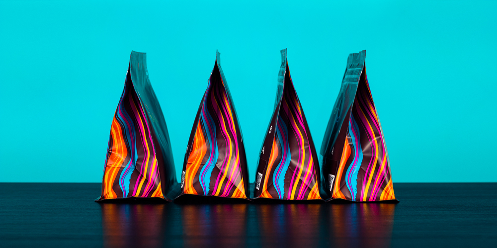 Дизайнеры используют яркие и сочные цвета, чтобы подчеркнуть силу стихии, которую сумел обуздать всадник. А приём с заполнением силуэта текстурой подходит не только для оформления упаковки, но и для брендирования остальных фирменных носителей.