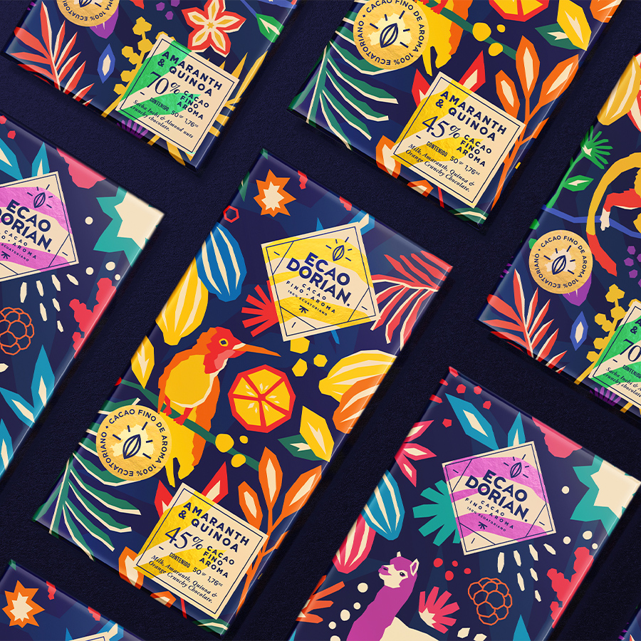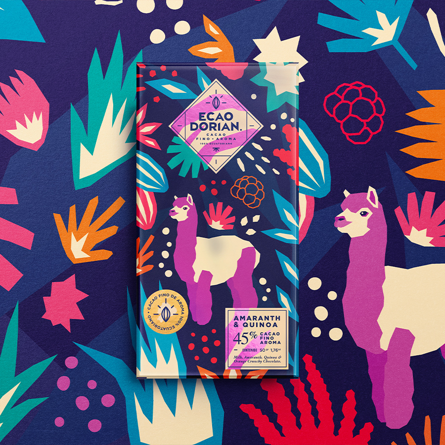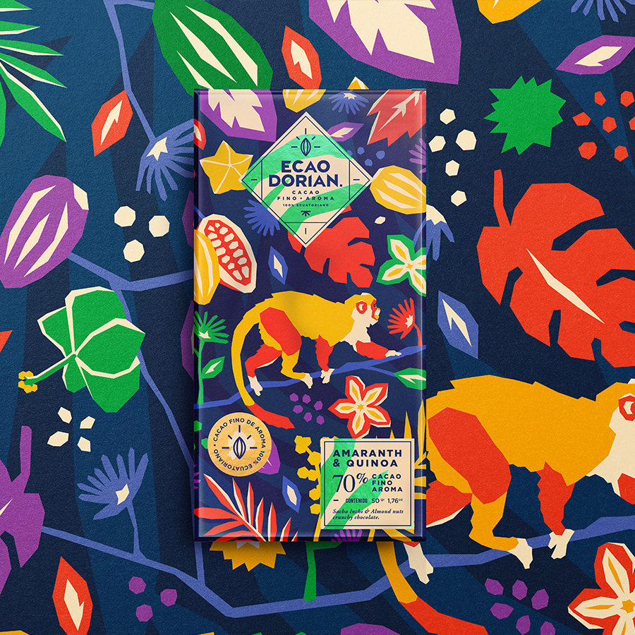 Графический дизайнер Jorge Campozano Alarcon отрисовал от руки серию иллюстраций, которые стали элементами бренда для использования в коммуникациях. Среди местных представителей флоры и фауны можно идентифицировать киноа, сача инчи и амарант – ингредиенты, входящие в состав шоколада Ecaodorian.