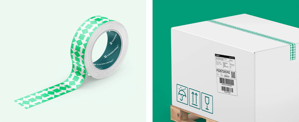 В основу фирменного приема лег все тот же прямоугольный элемент со скошенным краем: его протянули, что создало эффект объема и движения. Иконки также зарезаны под 45 градусов, схожие формы используются и в фирменном паттерне, они же присутствуют и в подобранном в агентстве шрифте. Фирменный паттерн используется локально: на фирменном скотче и шейных платках сотрудников офиса компании.