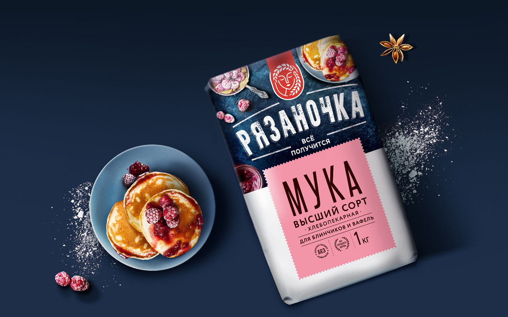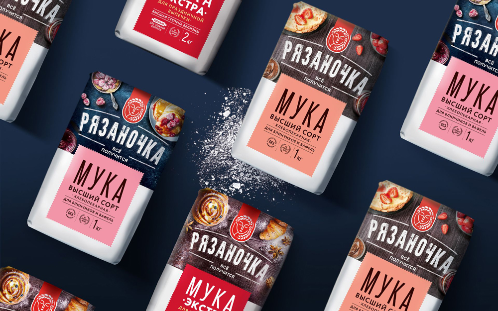 У Рязаночки появился символ – стилизованное изображение девушки, в волосы которой вплетены колосья и это создает неповторимый запоминающийся образ. В нижней части расположились зоны с описанием преимуществ продукта и категории. На большой марке был введен дифференцирующий цвет, чтобы люди могли легко отличить один сорт муки от другого.