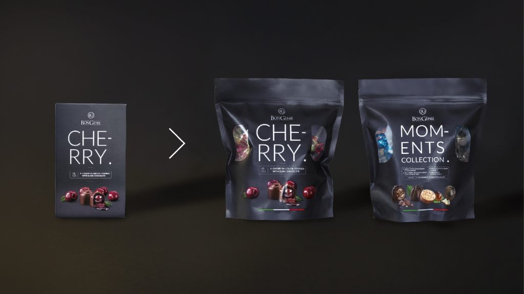 Бренд современных десертов BonGenie вводит новый вид упаковки для двух SKU. Задача агентства AVC - адаптировать для пакета дой-пак дизайн-концепцию, которая бы сочеталась со всей коллекцией.