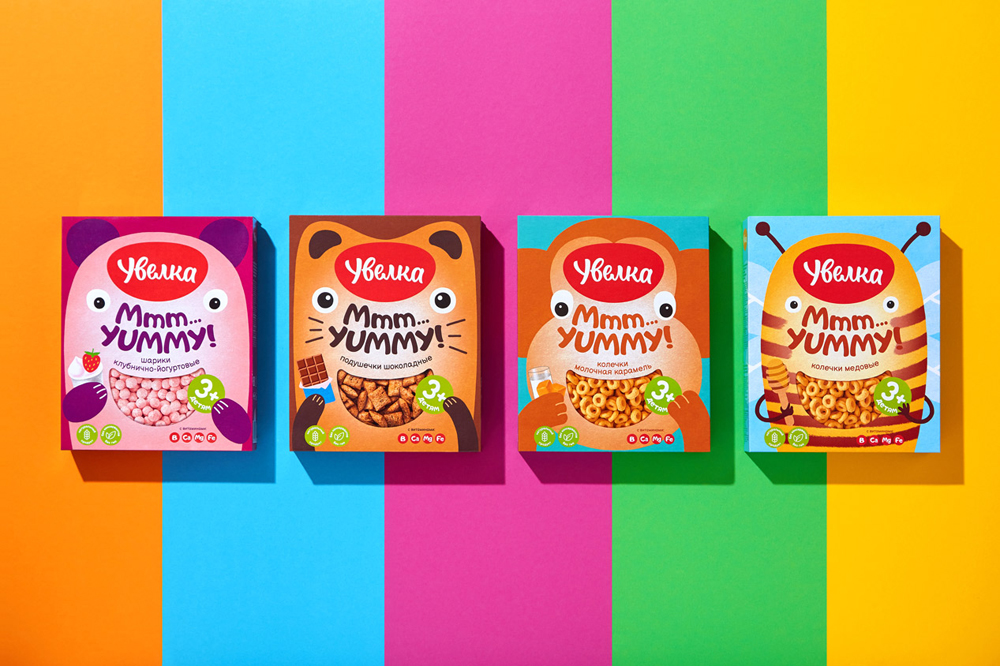 Сухие завтраки — продукт для всей семьи, поэтому дизайн упаковки должен быть интересен и детям, и взрослым. Fabula Branding разработали решение, центром которого стали милые и стильные персонажи, выделяющие линейку на полке. Крупные иллюстрации веселых медвежат, пчел, котят и обезьян отлично справляются с вкусовой отстройкой и вызывают положительные эмоции.