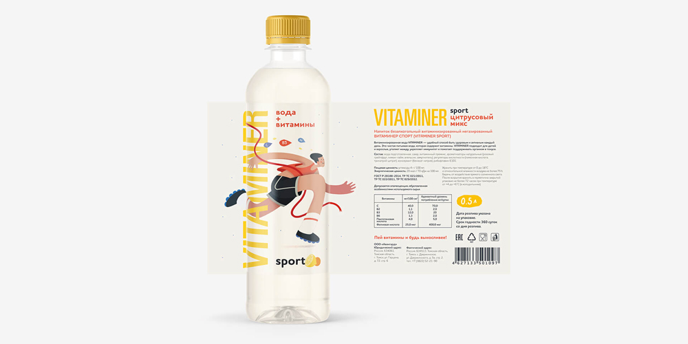 На старте в линейке Vitaminer четыре напитка: Sport, Relax, Immuno, Zero. У каждого — свой вкус, свой витаминно-минеральный коктейль и свой персонаж. На бутылке Sport разрывает финишную ленточку стремительный бегун, на Immuno гуляет под дождём жизнерадостная барышня, которой не страшны простуды. На Relax расслабляется в позе лотоса безмятежный йог, а на Zero идёт тренироваться подтянутая девушка, которая явно следит за количеством сахара в рационе.