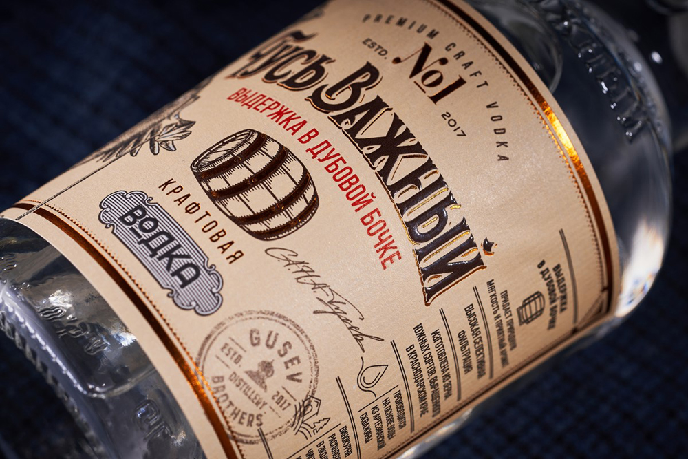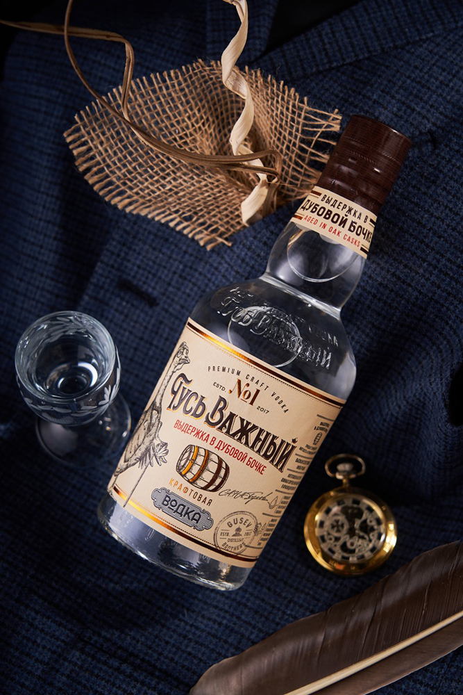 По заказу компании Gusev Brothers Distillery студия 43'oz создала дизайн упаковки для водки "Гусь Важный". Это водка, выдержанная в дубовых бочках.