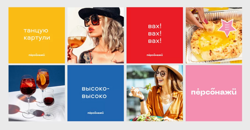 Основной акцент сделан на персонажах. Они могут восприниматься как гости заведения, а могут ассоциироваться с Грузией. Дизайнеры использовали векторные иллюстрации как собирательный образ различных черт и качеств людей. Они выполнены в дружелюбной манере и задают настроение бренда. Герои держат в руках гиперболизированные блюда — это отсылка к грузинским столам, которые ломятся от количества еды.