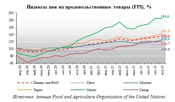 В ноябре 2021 г. среднее значение Индекса продовольственных цен ФАО (ИПЦФ) составило 134,4 пункта, что на 1,2% выше показателя октября 2021 г. и на 27,3% выше показателя ноября 2020 г. ИПЦ ФАО растет четвертый месяц подряд и достиг самого высокого значения с июня 2011 г. В конце ноября стало известно, что из-за проблем с глобальной системой поставок, ухудшения погодных условий и неопределенной ситуации в регионах производства цены на кофе достигли максимума за последние 10 лет. Сообщается также, что такая ситуация на мировом рынке сохранится до 2023 г.