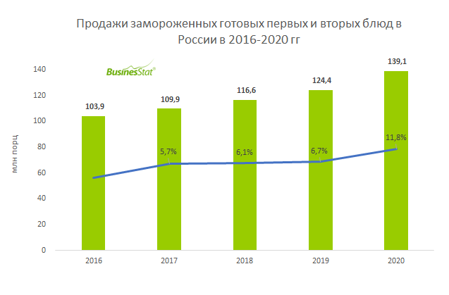 По данным , подготовленного BusinesStat в 2021 г, за 2016-2020 гг их продажи увеличились на 33,8%: со 103,9 до 139,1 млн порций. Рост продаж наблюдался ежегодно темпами 5,7-11,8% в год, при этом максимальный темп прироста рынка пришелся на 2020 г.