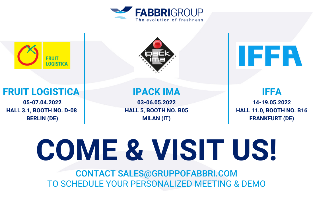 После этой выставки Gruppo Fabbri примет участие в ведущей отраслевой выставке IPACK-IMA, которая пройдет в Милане (Италия) с 03 по 06 мая 2022 г., а затем – в IFFA, которая пройдет во Франкфурте (Германия) в период с 14 по 19 мая 2022 г.