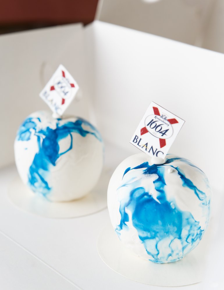«Ноты персика и свежесть Kronenbourg 1664 Blanc вдохновили нас на создание легкого десерта. Пирожное «Кураж» — это взбитый ганаш с персиковым пюре и бурбонской ванилью, с нежным персиковым компоте с кусочками яблок в центре, обрамленное ажурном бисквитом. Утонченный вкус и нежность десерта дополнили мягкие акварельные цвета», — Галина Корсак, владелица французских Brioche Bistro и Brioche Boutique.
