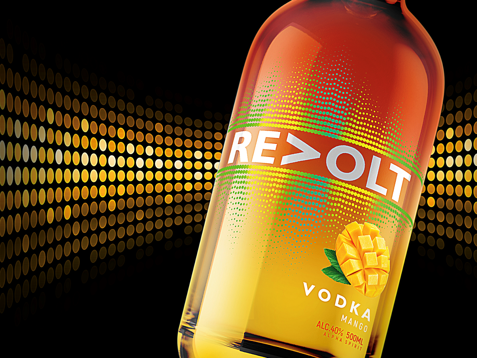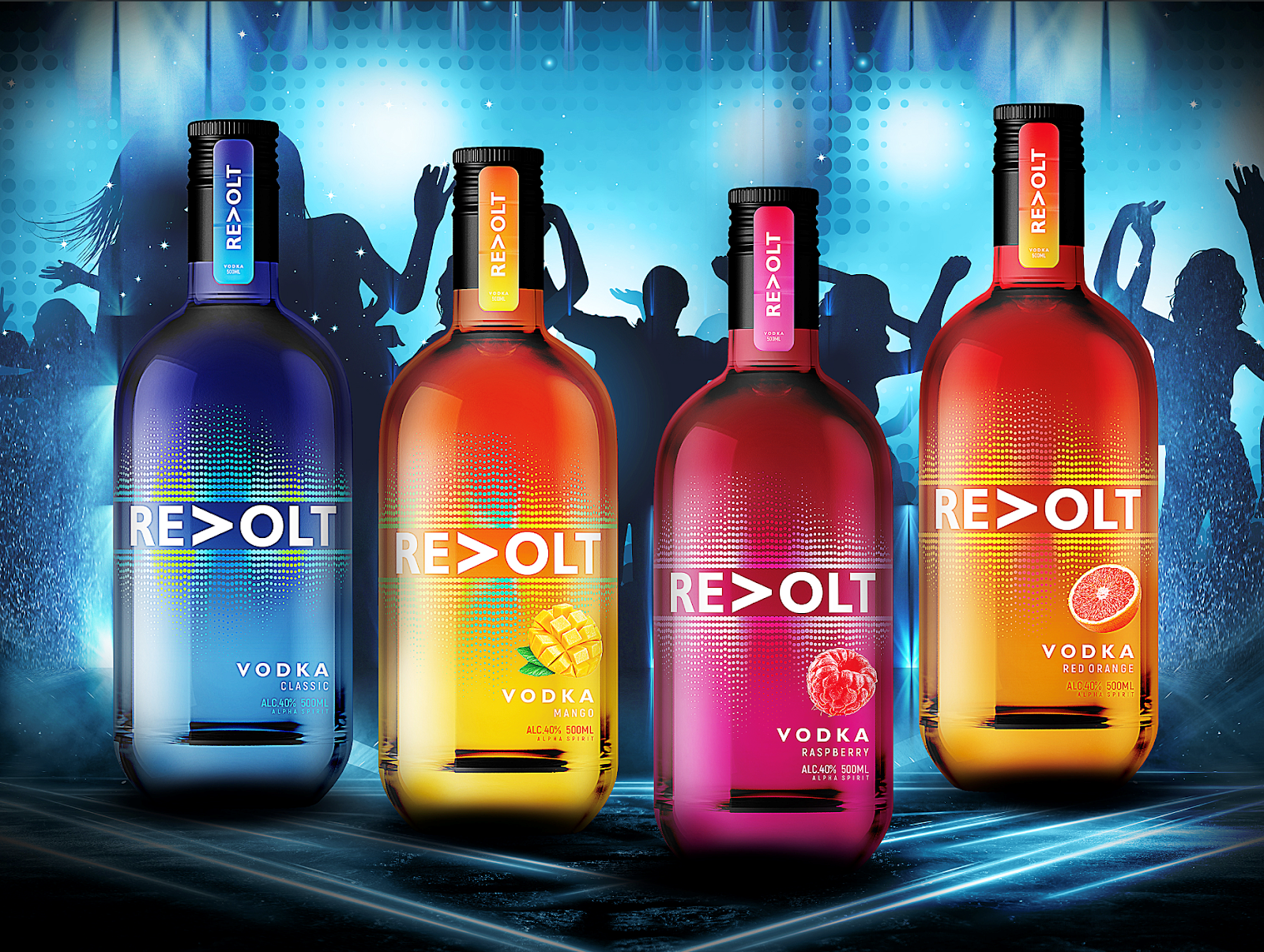 Яркие цвета каждого SKU позволяют новому бренду выделиться на полке и отстроиться от конкурентов. Вопреки всеобщей тенденции в сегменте водочной продукции, где классическим приемом остается иллюстрация русских морозов, льда и имитация запотевшей бутылки, айдентика «ReVolt» выделяет продукт в конкурентном окружении, а также утверждает позиционирование бренда как молодежного, яркого, тусовочного.