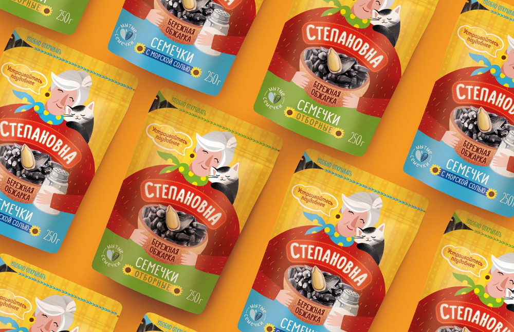 Неотъемлемая часть дизайна в продуктовом брендинге — это показать вкус, и этого не было в прошлой концепции. В новом дизайне на лицевой части упаковки мы видим в руках у нашей бабушки большую плошку жареных семечек. Призыв «устраивайтесь поудобнее» настраивает на приятное и спокойное времяпрепровождение.