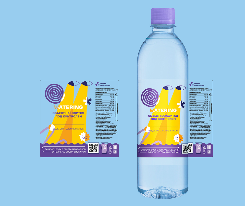 И третий вариант - это водный наблюдатель. Вода, “контролирующая” водный баланс в организме. В этикетке в комичном стиле обыгран тренд на оздоровление и отслеживание водного баланса. Сама бутылка следит за этим. Также применяется прием персонализации.