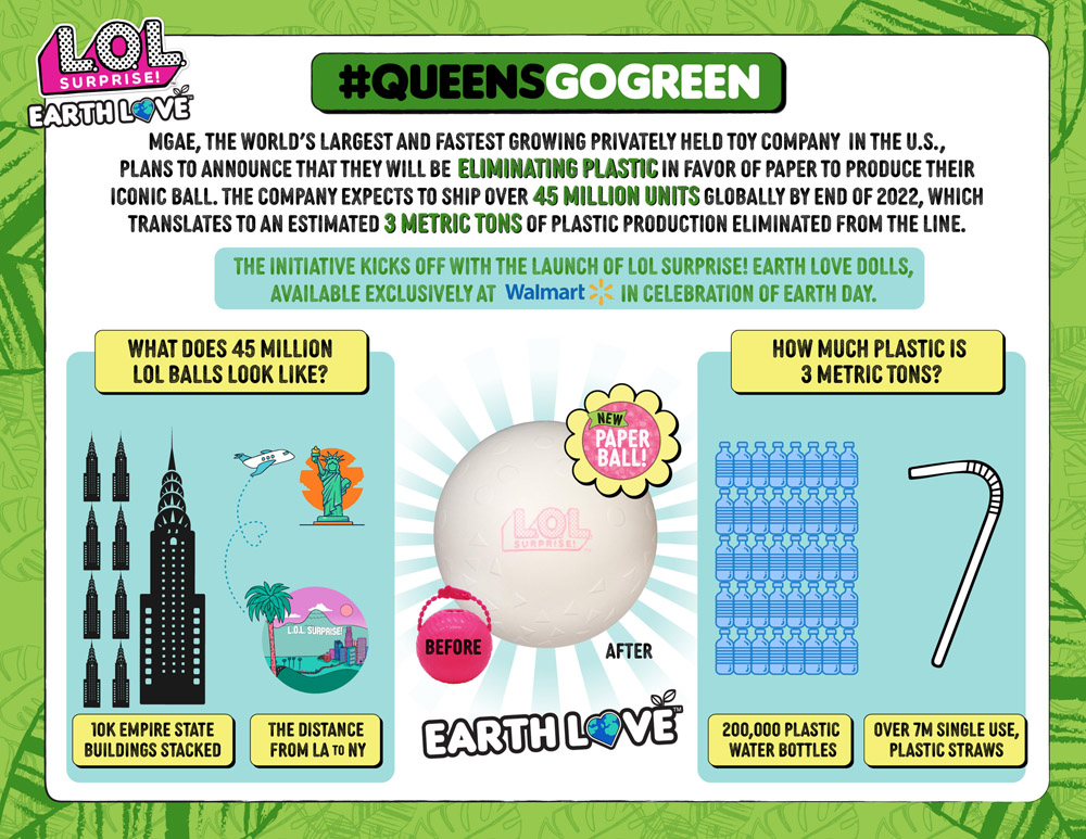 Куклы с огромными глазами L.O.L. Surprise! стали настоящим международным феноменом, сделав MGA Entertainment самой быстрорастущей частной компанией в США. Но с ростом продаж увеличивается и экологический урон – куклы продаются в фирменных пластиковых шарах. Кроме того, множество кукольных аксессуаров также упаковано в пластик.