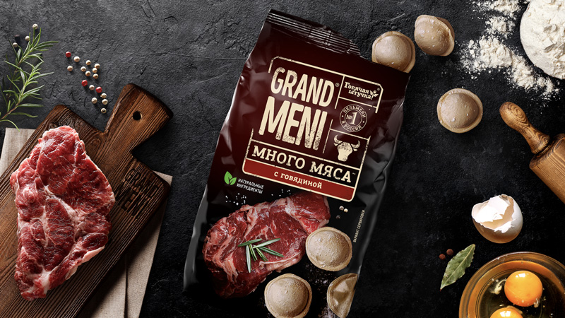 Grandmeni получили своё название за счёт большого содержания в каждом пельмене начинки из отборного мяса свинины и говядины, а также благодаря составу исключительно из натуральных ингредиентов. Для такого продукта специалисты агентства создали соответствующий дизайн: минималистичный, премиальный, честный, аппетитная фудзона которого обещает настоящее наслаждение вкусом.