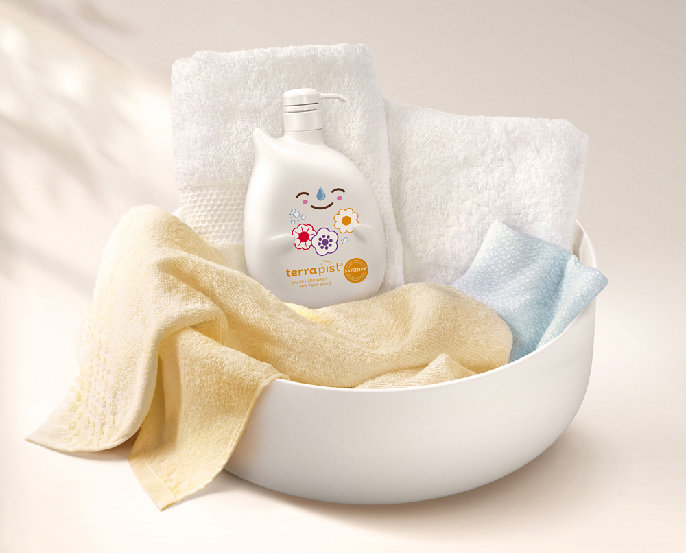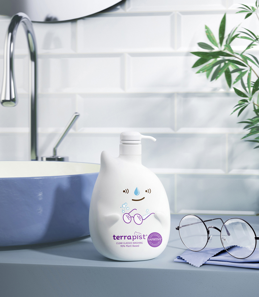 Агентство Prompt Design представляет дизайн упаковки для моющих средств Terrapist. В линейку входят средства для мытья рук, посуды, для стирки масок.