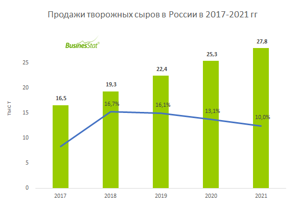По данным , подготовленного BusinesStat в 2022 г, с 2017 по 2021 гг их продажи в стране выросли на 68,6%: с 16,5 тыс т до 27,8 тыс т. Рост был вызван изменением культуры потребления россиян, творожные сыры стали активно использоваться в кулинарии, при приготовлении роллов, чизкейков, капкейков и других блюд. Категория популярна в развитых странах, западные концерны вели активное продвижение творожных сыров в России. Ежегодный рост производства творожных сыров в стране составлял в среднем 14%. Иностранные компании изначально взяли курс на строительство производственных мощностей в России, поэтому доля импорта в продажах невелика: в 2017-2021 гг она в среднем составляла 14,7%.