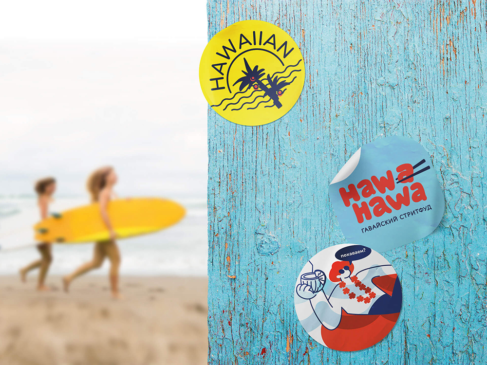 Как едят главное блюдо гавайского стритфуда поке? Конечно, палочками! Эта особенность и легла в основу логотипа, исполненного с помощью уникального авторского шрифта. Гавайи ассоциируются с пляжем, морем, солнцем и беззаботностью – все эти настроения нашли своё отражение в фирменном стиле новой покетерии. Получилось ярко, весело и непринуждённо, а главное – с гавайским вкусом! Также в рамках концепции были созданы красочные молодёжные стикерпаки с забавными иллюстрациями и смешными Hawa-копирайтами.