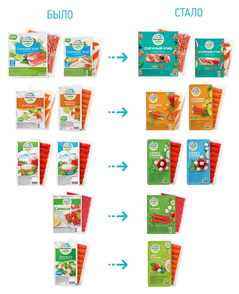 Ассортиментные позиции внутри линейки крабовых палочек и мяса под ТМ «Меридиан» теперь различаются и по цвету фона упаковок, чтобы покупателям легче было различать их.