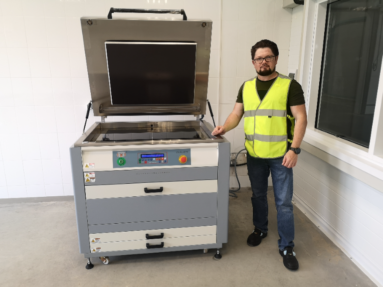 В июле текущего года на производственной площадке компании «Хухтамаки Алабуга» (г. Елабуга, Республика Татарстан) специалистами компании «ЯМ Интернешнл» был запущен водовымывной процессор для изготовления форм высокой печати 3ES-COMBI-FPK50 формата 500 х 700 мм. Оборудование имеет башенное построение и включает в себя все модули, необходимые для обработки пластин (экспонирование, вымывание, сушка и пост-экспонирование).