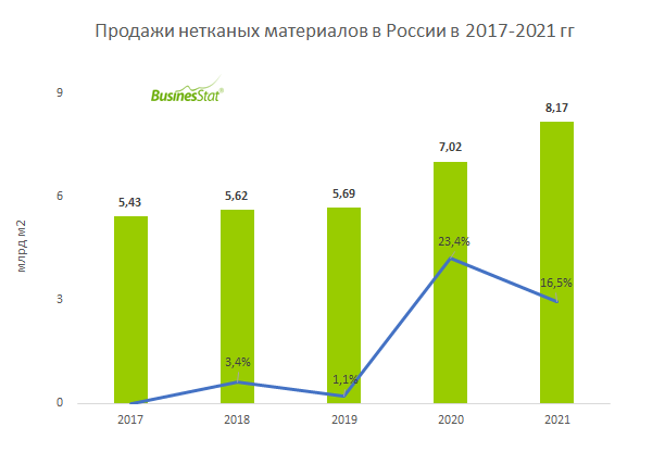 По данным «», подготовленного BusinesStat в 2022 г, в 2017-2021 гг их продажи в стране выросли на 50%, с 5,43 млрд м² до 8,17 млрд м². Продажи росли на протяжении всего рассматриваемого периода. В 2020 г темп прироста продаж нетканых материалов в России был максимальным за пятилетие и составил 23,4%. Это было вызвано возросшим под влиянием пандемии спросом на медицинские маски. В 2021 г продажи увеличились еще на 16,5%, что было вызвано по-прежнему высоким спросом на средства защиты от коронавируса.