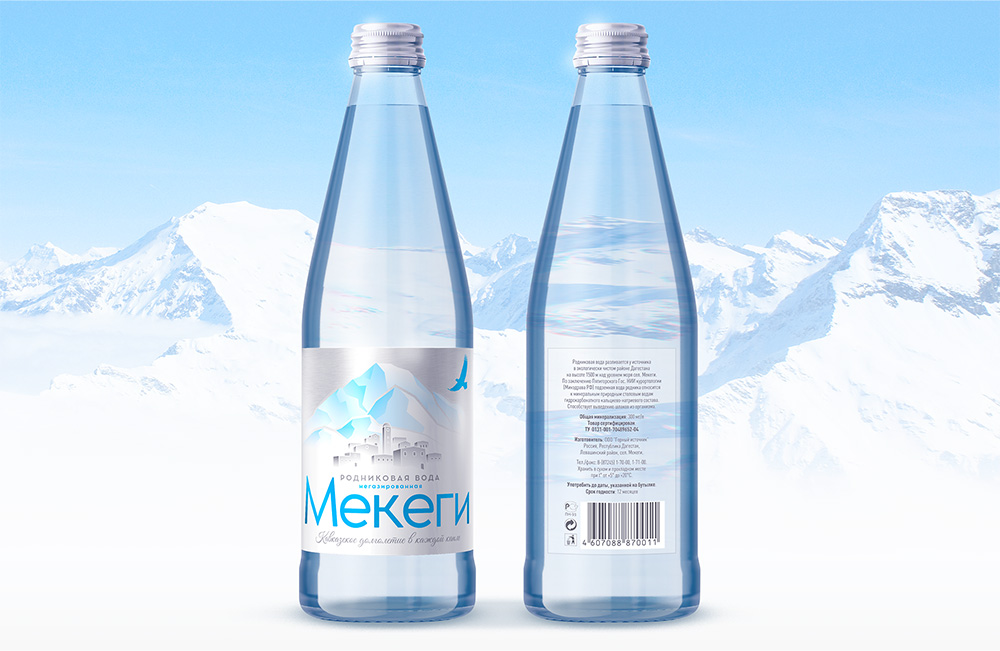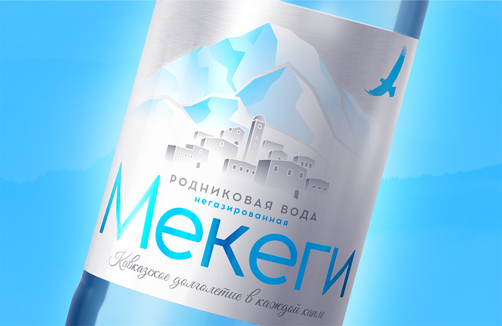 Брендинговое агентство Style You разработало новый бренд воды "Мекеги". Необходимо было создать товарный знак и этикетку для минеральной воды из Дагестана, которая добывается в горах села Мекеги.