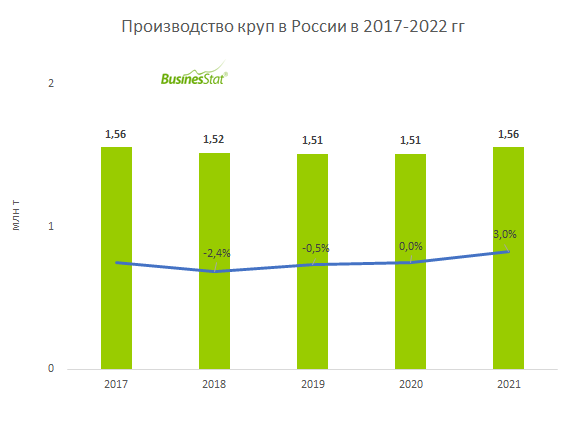 По данным , подготовленного BusinesStat в 2022 г, объем ее производства в стране в 2021 г остался на уровне 2017 г и составил 1,56 млн т. При этом доля импорта крупы от продаж в течение прошедшего пятилетия снизилась: с 15,7% в 2017 г до 12,8% в 2021 г.