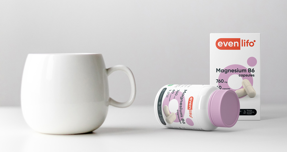 Логотип EvenLifo по форме напоминает капсулу, в которую вписана текстовая часть. Буква О с дополнительной точкой далее развивается в полноценный элемент фирменного стиля, интегрируется в дизайн упаковки и добавляет идентичности бренду.