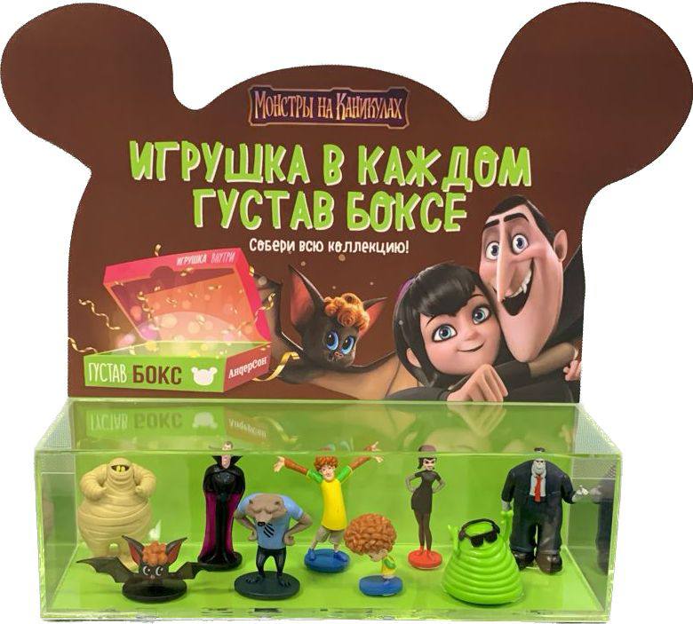 «Монстры на каникулах» – комедийная анимационная сага, свежий и современный взгляд на классических монстров. В новую серию входят 9 коллекционных 3D-игрушек любимых героев, а на оборотной стороне бокса – стильная раскраска с Дракулой, Мэйвис и Френки.
