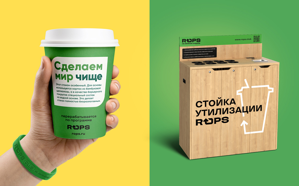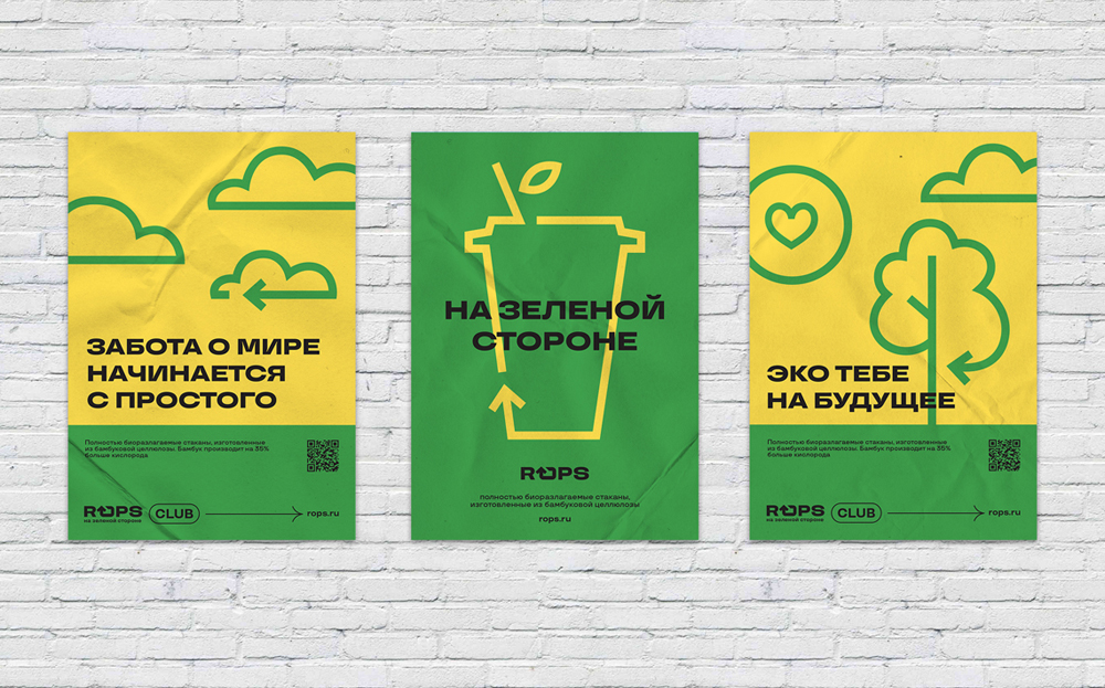 ROPS — это доступный каждому способ внести свой посильный вклад в глобальное дело сохранения природных ресурсов. Основная идея бренда заключается в том, что действовать экологично — это просто. Слоган «На зеленой стороне» хорошо раскрывает главный посыл, а фирменный стиль визуально поддерживает эту мысль.