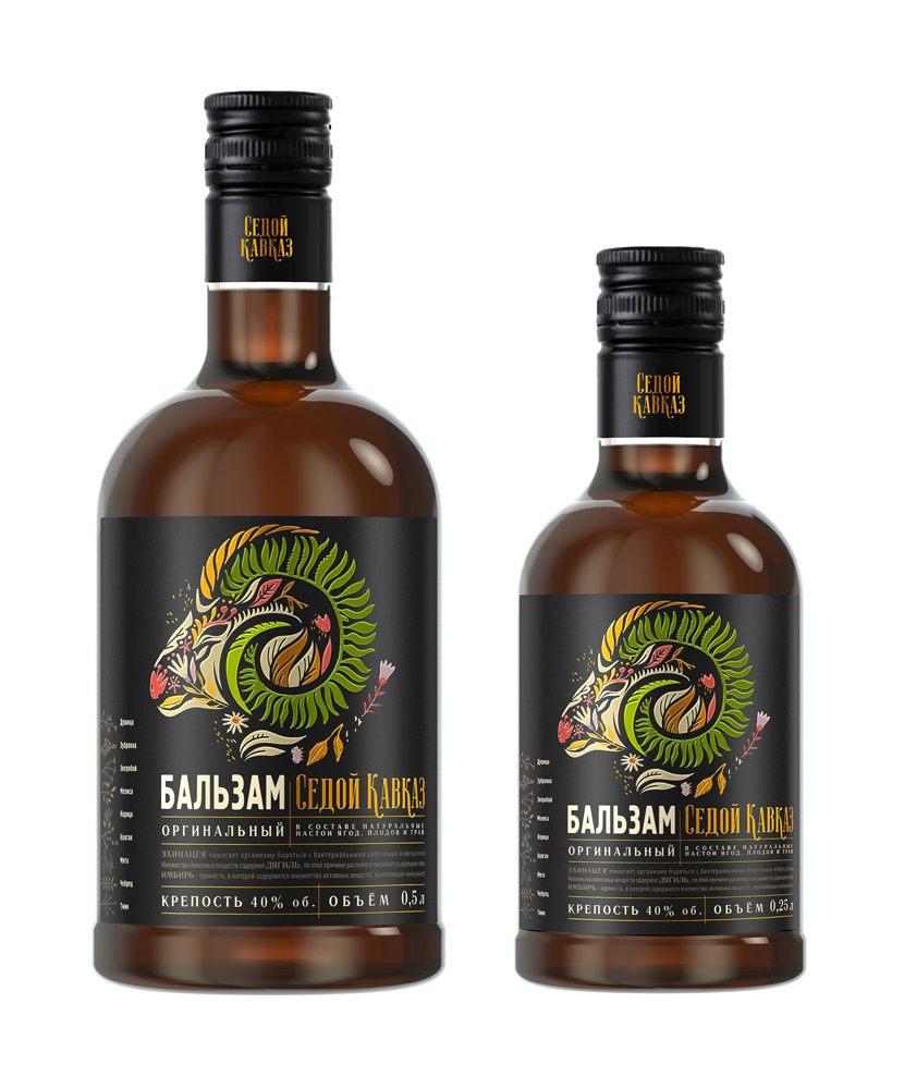 В дизайне этикетки бальзама «Седой Кавказ» использован стилизованный растительный орнамент в виде головы барана, как символическая отсылка к художественным традициям и мифологии народов Северного Кавказа, для которых характерно особое отношение к этому животному. В кавказской орнаментике мотив бараньей головы или лихо закрученных бараньих рогов, иногда прорастающих листочками, играл роль своеобразного оберега, являлся символом плодородия и материального благополучия.