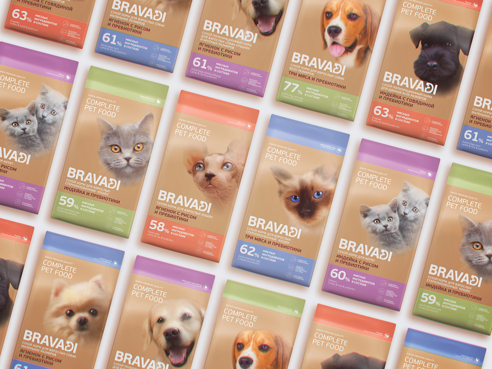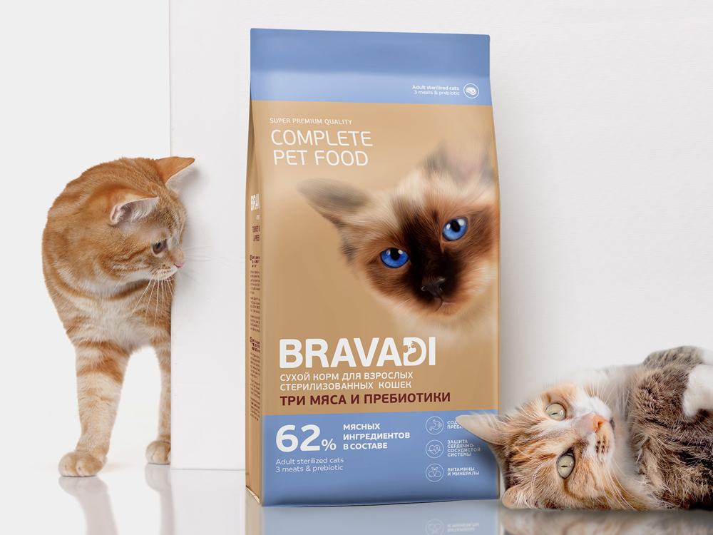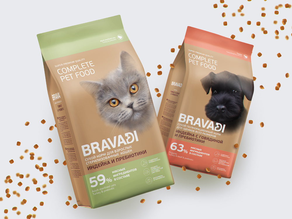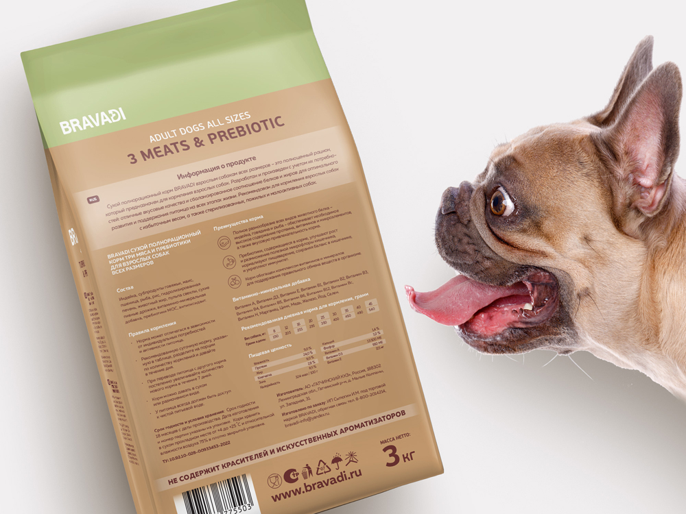 Разработка дизайна упаковки Bravadi подразумевала последующую адаптацию под различные форматы упаковки: паучи, консервы и т.д. Разработанный концепт с легкостью переносится под любой формат и остается на полке единым цветовым пятном, что дает возможность покупателю быстро найти новый бренд в любом магазине. Техническая информация на обороте упаковки изложена в спокойной табличной форме, удобной для прочтения.