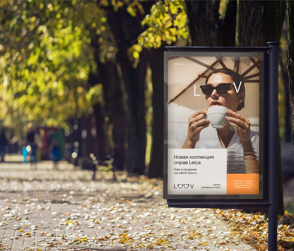 В агентстве создавали демократичный бренд, с прямой и понятной коммуникацией. Для этого использовали схожесть неологизма LOOV с оправой очков. Графику встроили в лого таким образом, что оправа очков заменила буквы OO. Для построения дизайн-системы выбрали простые флетовые формы, для акциденции используется оранжевый цвет. Для придания индивидуальности использовали дефракционную текстуру.