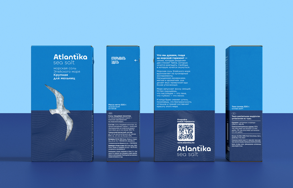 Основные графические элементы бренда – чайка, море и горизонт. Все они запускают волну эмоций и служат метафорой безграничных творческих возможностей, неисчерпаемой энергии и преодоления препятствий. Море всегда одно и то же и всегда бесконечно разнообразно. И потому морская соль Atlantika вдохновляет на кулинарные эксперименты, дарит свободу пробовать новое и изменять привычное.