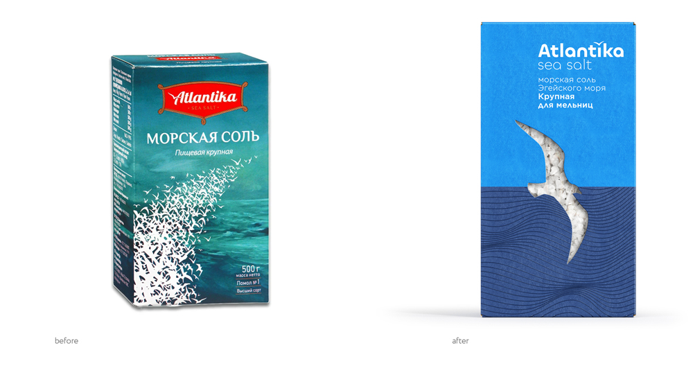Дизайнеры прописали легенду бренда, отталкиваясь от происхождения соли, переосмыслили визуальный язык и актуализировали бренд, добавив ему новое прочтение, при этом сохранили узнаваемый символ бренда – чайку. Ввели наглядную дифференциацию разных видов соли по цвету, теперь покупатель не перепутает продукты в магазине. Улучшили заметность товара на полке. На упаковки новой линейки, там, где это возможно технологически, добавили окошки, благодаря которым покупатель видит продукт заранее перед тем, как совершить покупку.