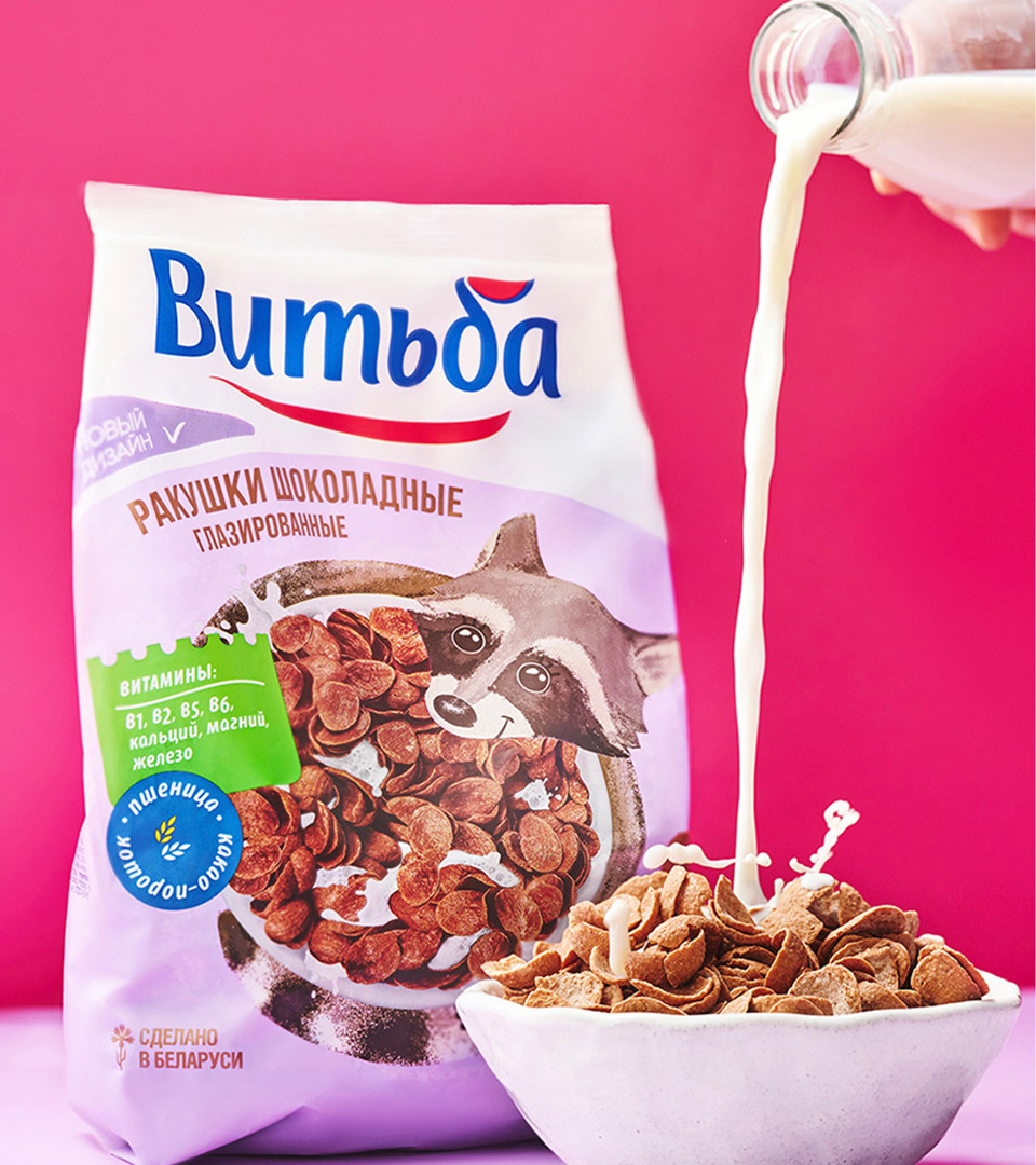 Агентство PG разработало редизайн упаковки двух линеек сухих завтраков "Витьба", одна из которых направлена на более взрослую аудиторию, а вторая — на детей. С другой стороны, глазированные хлопья-ракушки с милым приветливым енотом на упаковке — такой продукт будет уместным на любой кухне.