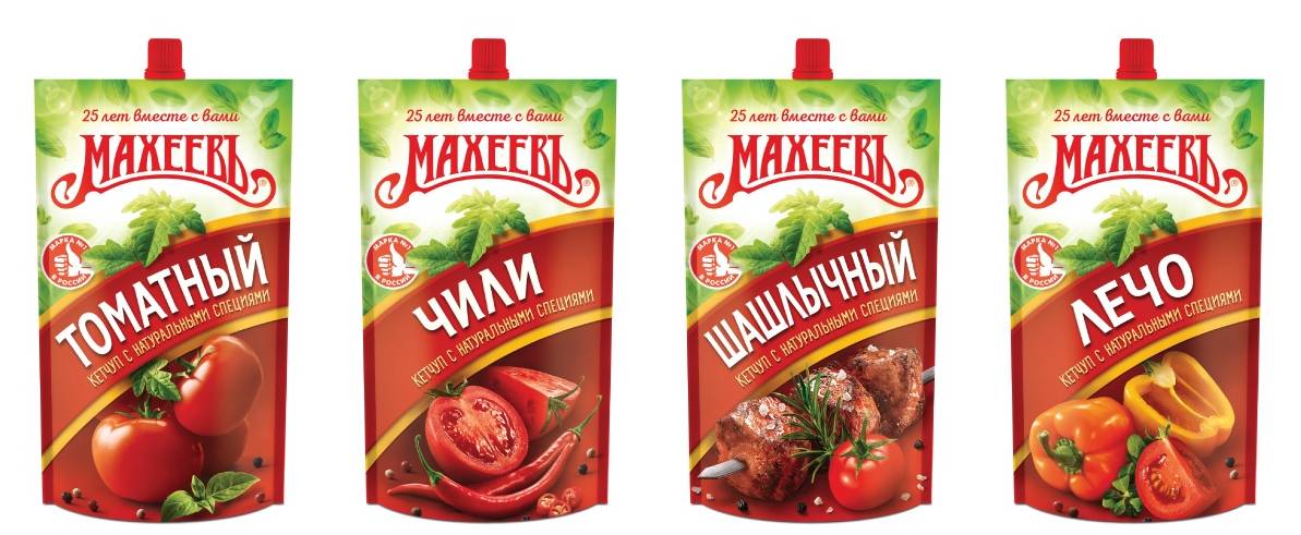Бренд «Махеевъ» обновила дизайн упаковок своих топовых кетчупов: в визуально усовершенствованных дой-паках теперь продаются кетчупы «Шашлычный», «Томатный», «Лечо» и «Чили».