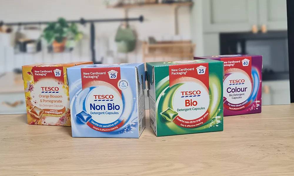 Tesco заменяет пластиковые контейнеры для капсул со стиральными порошками на перерабатываемые картонные коробки