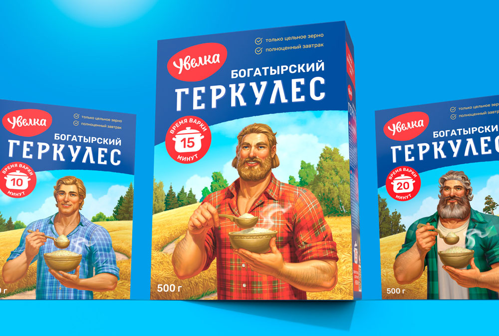 Какие они — современные богатыри? Смелые и крепкие, как их предки, они ценят своё здоровье и время, следят за собой и заботятся о питании. Вполне закономерно, что именно такой образ стал основой для упаковки геркулеса "Богатырский" компании "Увелка". Дизайн разработан специалистами агентства "Гордость".