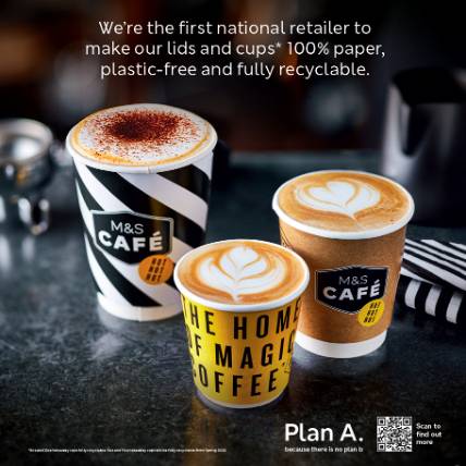 Со временем бумажный стаканчик станет доступным во всех кафе M&S. Каждый стаканчик с кофе, от традиционного латте до нежного капучино, имеет привлекательный дизайн с надписью «Стопроцентная пригодность к вторичной переработке».
