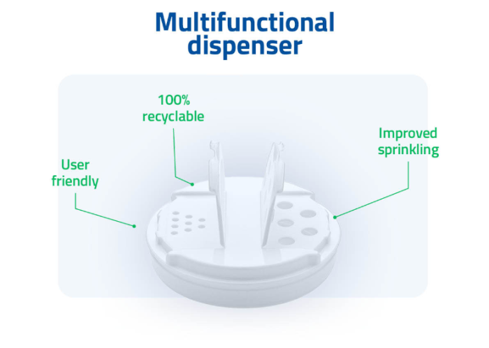 Эта многофункциональная дозирующая крышка включает в себя оригинальную систему с двумя клапанами со встроенной функцией защиты от несанкционированного вскрытия и позволяет потребителям дозировать необходимое количество сахарной пудры. Это благодаря одному отсеку с 5 отверстиями большего размера и одному – с 9 отверстиями меньшего размера.