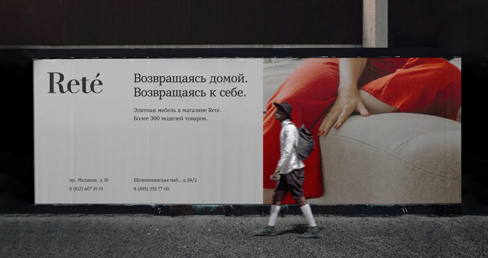 В шрифтовом логотипе используется антиква нового стиля с высоким контрастом штрихов, что делает его начертание более утончённым. Ежедневные соприкосновения с мебелью и декором создают тесную связь с домом и формируют пространство безопасности и принятия себя. Эту идею дизайнеры положили в основу бренда Reté.