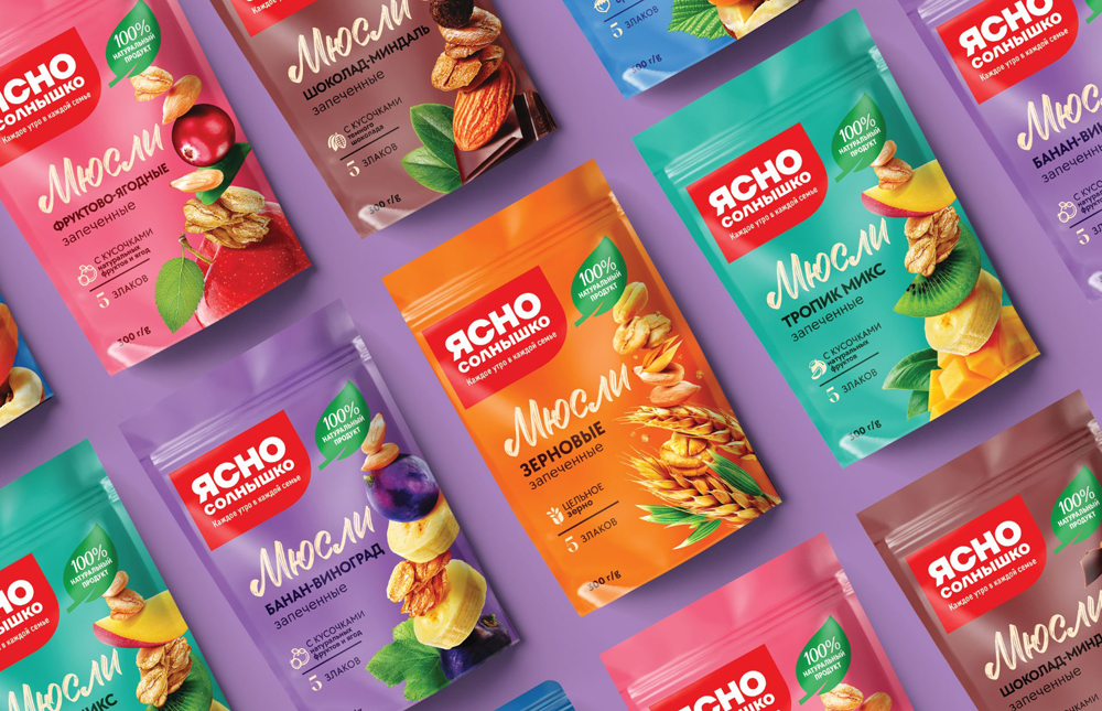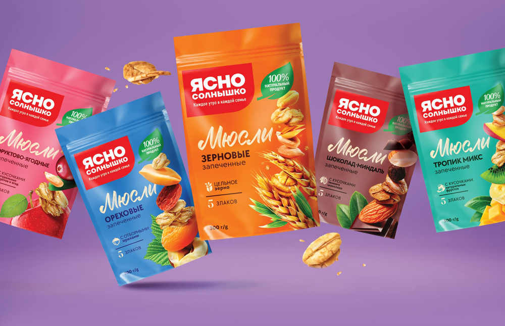 В агентстве Getbrand разработали дизайн для линейки мюсли под брендом "Ясно Солнышко" для компании Петербургский Мельничный комбинат.