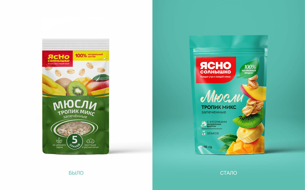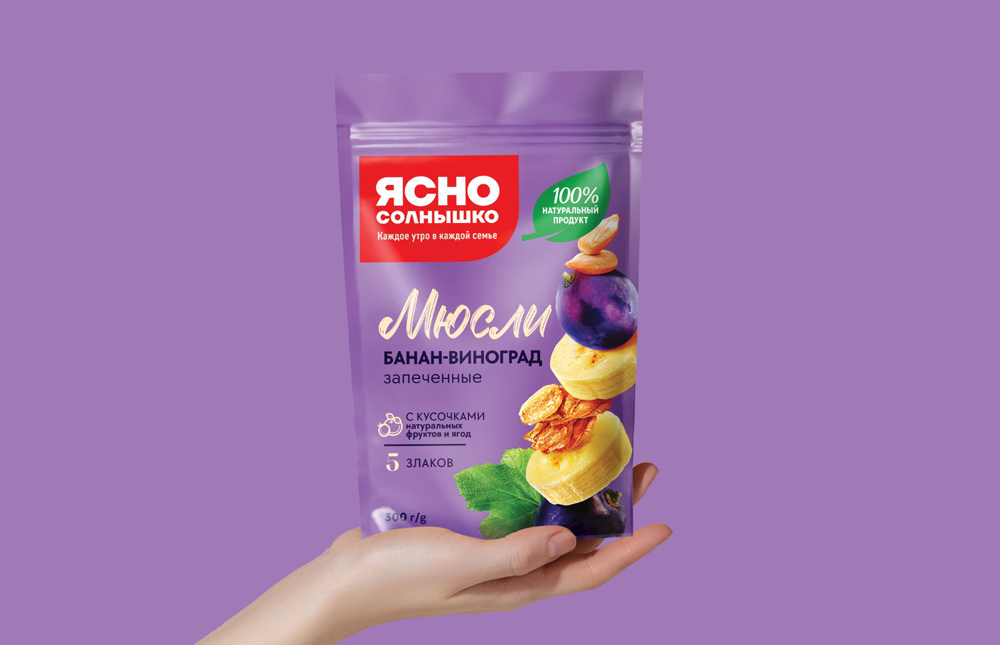 В агентстве разработали для бренда «Ясно Солнышко» дизайн линейки хлопьев и каш, и в этот раз было необходимо адаптировать разработанную архитектуру дизайна на линейку мюсли.