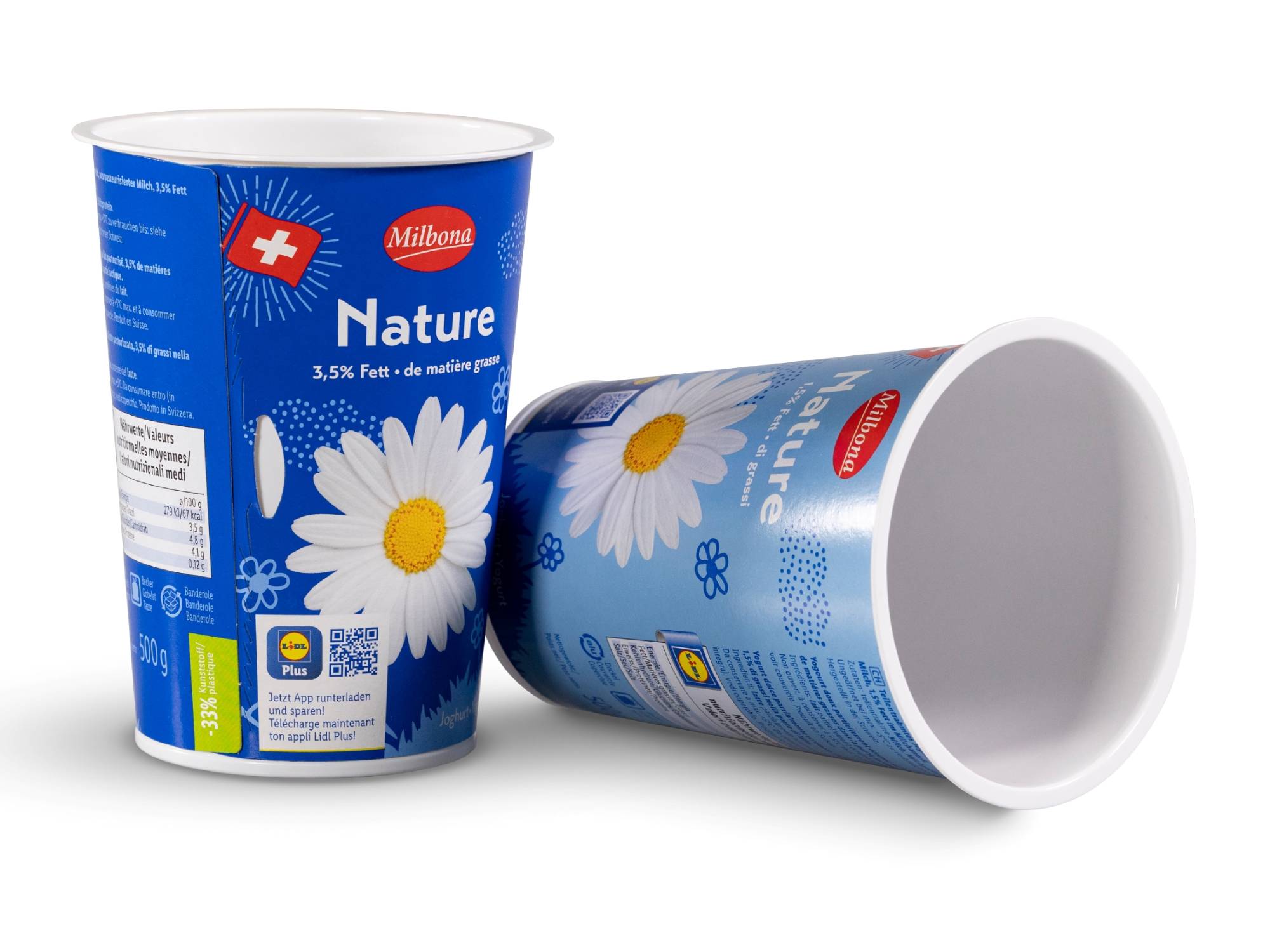 В стаканы K3® r100 ёмкостью 500 г фасуются натуральные йогурты марки Milbona жирностью 1,5% и 3,5%, продаваемые в филиалах Lidl Schweiz.