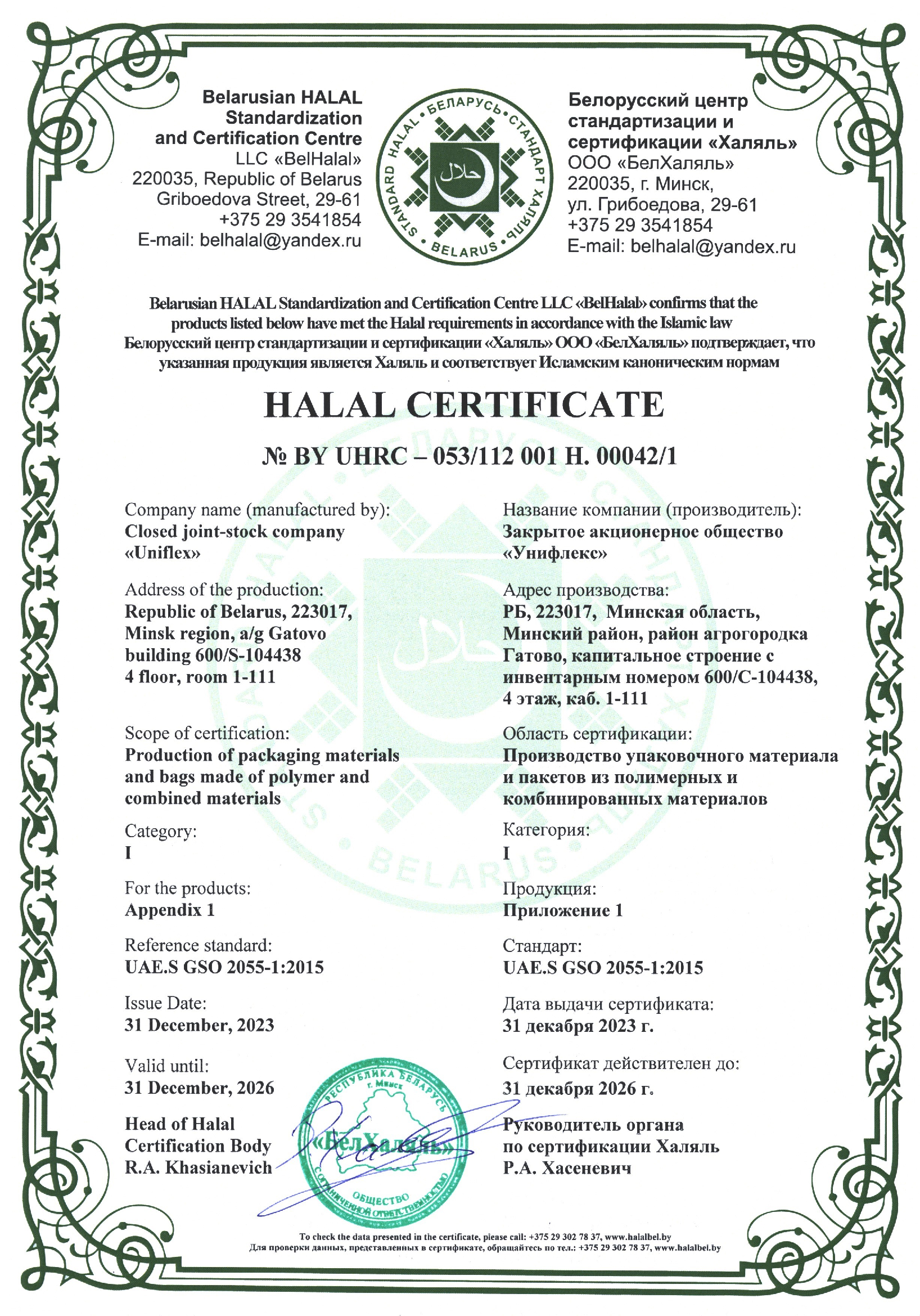 Компанией «Унифлекс» успешна пройдена процедура сертификации по системе «Халяль» - соответствие Исламским каноническим нормам (стандарт UAE.S GSO 2055-1:2015).