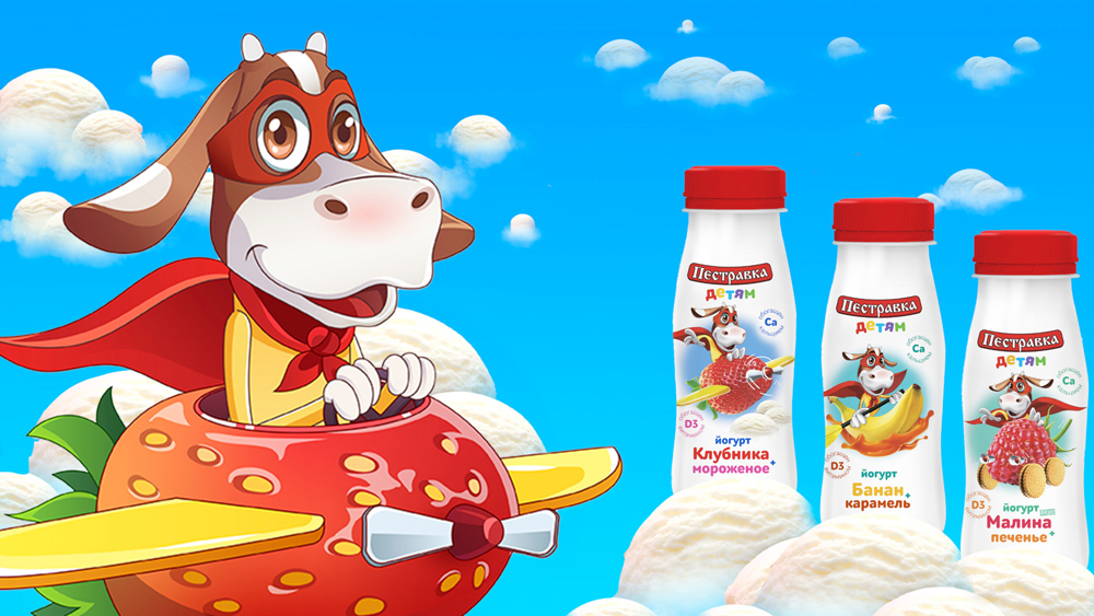 Что касается оформления детской линейки продуктов «Пестравка», для нее был придуман специальный персонаж – теленок-озорник Яша. Он – настоящий непоседа. То летает на самолете из клубники, то плавает в лодке из банана, то катается на машине из малины, а на упаковках с мороженым играет в прятки. О похождениях Яши периодически рассказывают социальные сети бренда.