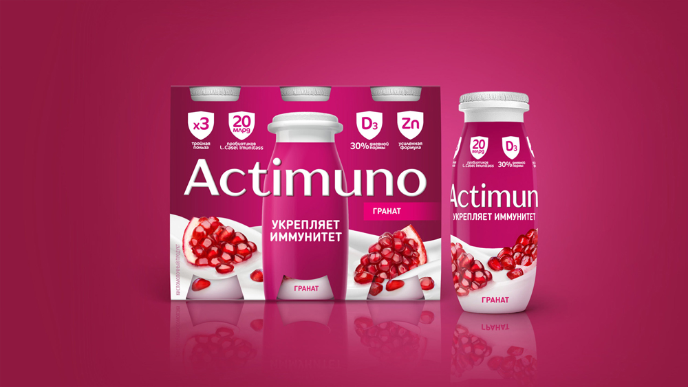 В обновленном дизайне Асtimuno специалисты агентства немного перестроили композицию, в нижней трети упаковки стали использовать белые йогуртовые волны, в которые интегрируются различные ягоды и фрукты — данный подход добавляет аппетитности, а так же максимально просто и заметно позволяет потребителю различить состав каждого конкретного SKU, успешно решая проблему “красных ягод” и пурпурного фона, не нарушая при этом цветовую блочность. Более лаконично был переработан графический блок с RTB, для информационных иконок была использована форма щита, усиливающая коммуникацию об укреплении иммунитета.