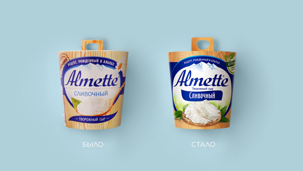 Последние визуальные изменения упаковки произошли в 2014 году, и по прошествии времени дизайн стал нуждаться в некоторой логичной и эволюционной актуализации. В процессе работы над редизайном специалисты агентства постарались усилить и сильнее раскрыть продуктовую составляющую бренда, интегрировав в дизайн более понятные, заметные и аппетитные фуд-группы. Цветовую дифференциацию между вкусами, которых стало больше, сделали более очевидной, заметной и удобной для потребителя. В дизайне упаковки разместили небольшой сторителлинг, раскрывающий суть рецептуры Almette — молодой творожный сыр, взбитый со сливками. Также был разработан новый заметный клейм о натуральности и новая более натуральная деревянная фактура “бочонка”.