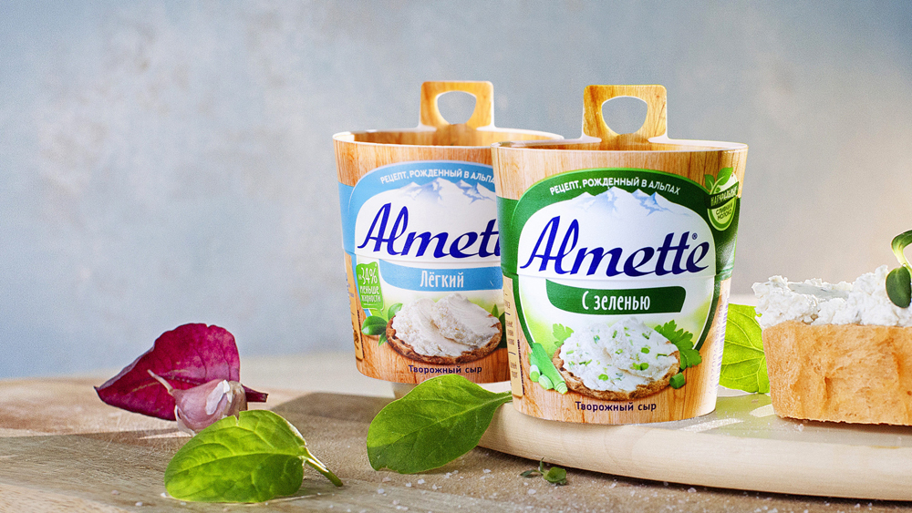 Творожный сыр Almette — один из основных брендов немецкой семейной компании Hochland, которая 90 лет специализируется на производстве сыров. Упаковка бренда всегда выделялась среди конкурирующих марок на полках благодаря своей выразительности и уникальности — форма бочонка с теплыми деревянными фактурами великолепно помогает транслировать присущие бренду ценности, и конечно, делает его весьма узнаваемым и запоминающимся.